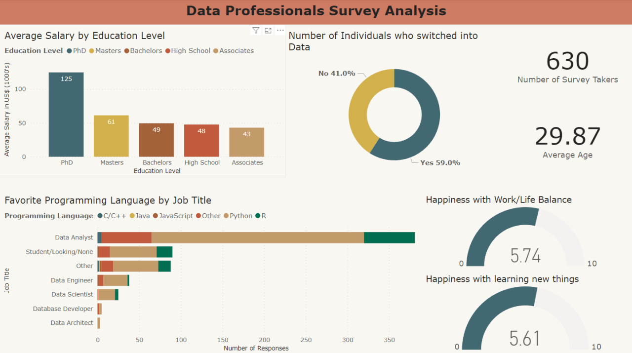 Created an interactive Power BI dashboard analyzing a Data Professional Survey. Cleaned and transformed survey responses with Power Query and visualized key trends such as demographics, tools used, and salary insights.